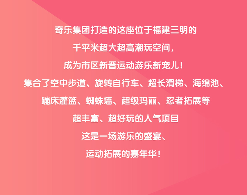 福建三明運(yùn)動(dòng)游樂館現(xiàn)已竣工投入運(yùn)營,各位家長可帶上小朋友一起去體驗(yàn)一下,同時(shí)也可以感受一下奇樂集團(tuán)對(duì)于此樂園的設(shè)計(jì)理念和品質(zhì)的把控,也歡迎大家提出寶貴的意見,讓我們能夠精益求精的打造出更好的樂園。