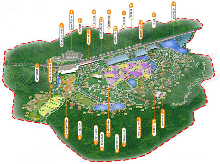 2.本分為游客服務區(qū)、一期停車場、休閑游樂區(qū)、研學科普區(qū)、花海觀光區(qū)、野奢民宿區(qū)、運動探險區(qū)、二期停車場、山體燈光秀等9個區(qū)。