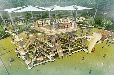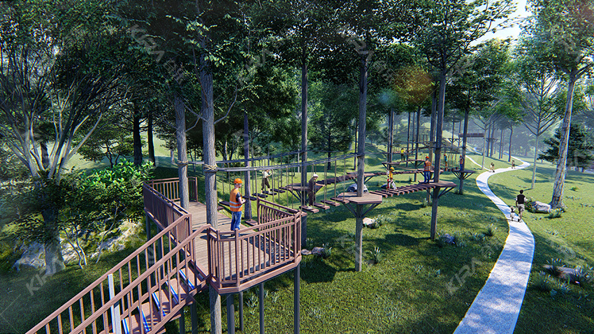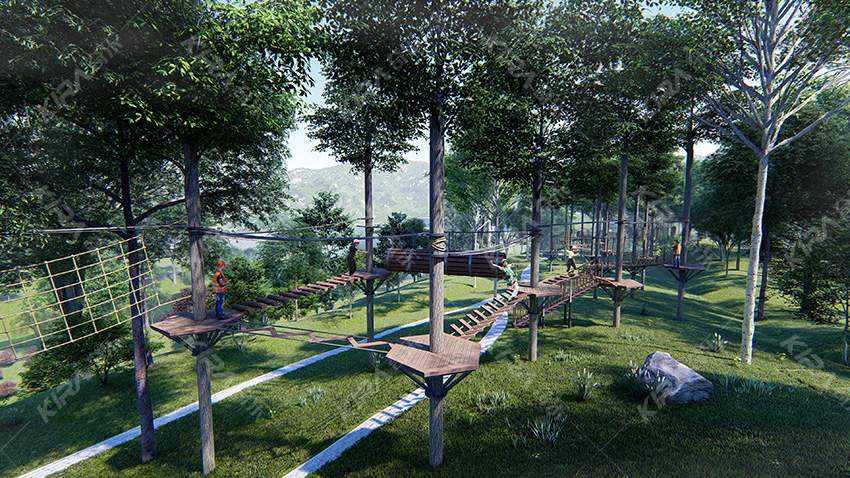 本項目適用于各種親子主題類的樂園,巧妙運用“熊貓”IP造型設計,集拓展、探險、滑道、飛索、蹦極、不銹鋼滑梯、攀巖、爬網等46種不同運動體驗的文化主題項目,結合“大灰熊”IP形象,融入相關設計元素,打造差異化的網紅IP主題性運動拓展營地綜合體。 在裝飾設計上采用竹葉和竹竿的綠色設計元素,以原生態、自然風格為基調,采用原木、繩網和不銹鋼等柔韌度好的生態材料。滿足大眾貼近自然、主題鮮明、寓教于樂的兒童素質訓練教育親子樂園的精神訴求。