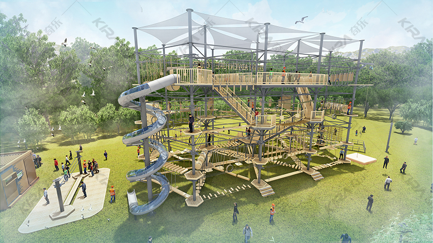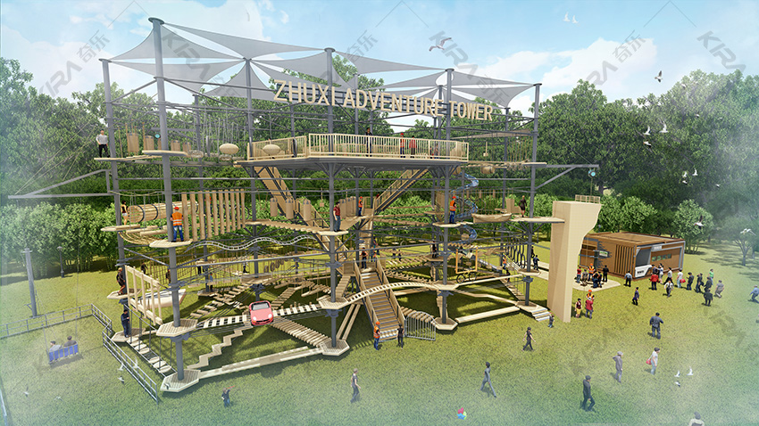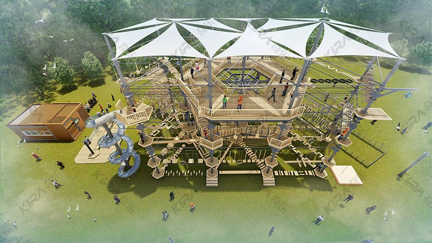 以晶體結構搭建架空層2-4個步道層級,打造層超過650米長的空中游樂路線,其中包含91個運動項目(包括尖叫滑梯、矩形秋千、低空蹦極、戶外攀巖等4個)