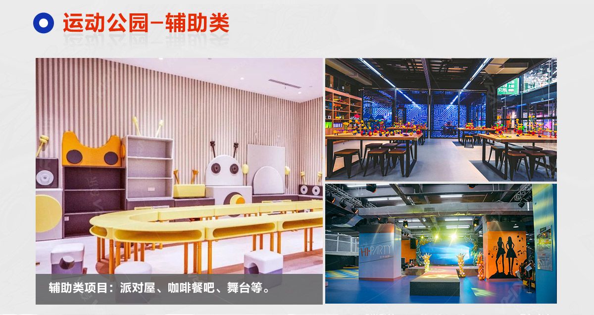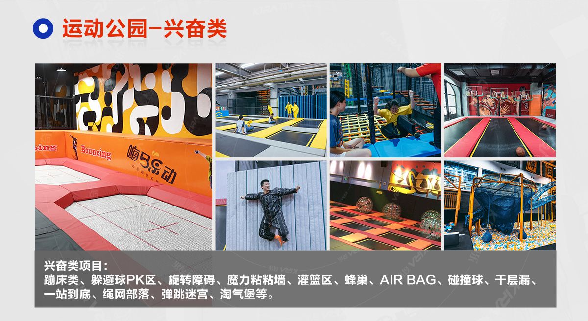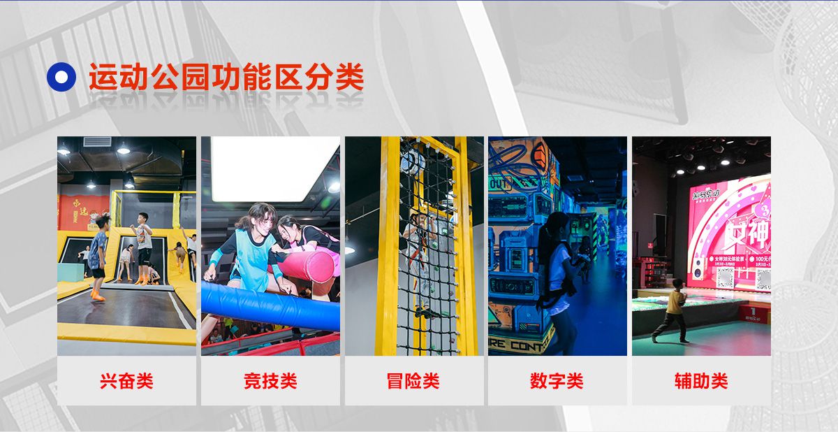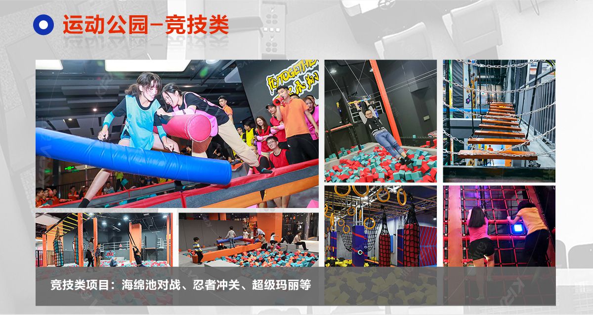 超級運動公園源自美國,以業(yè)態(tài)分布劃分,可分為成人娛樂版塊、兒童娛樂版塊、潮流科技及輔助配套四大功能版塊;以運動程度劃分,可分為基本區(qū)、興奮區(qū)、冒險區(qū)、數(shù)字科技區(qū)、輔助區(qū)。適合全年齡段玩家參與娛樂,打破年齡、性別、愛好等限制,為大眾呈現(xiàn)一幅“快樂運動 有氧生活”的精彩運動娛樂公園。 高格調(diào)與國際接軌的優(yōu)質(zhì)項目,引領(lǐng)玩家突破常規(guī)的運動局限,體驗全新的運動嘉年華:自由蹦床區(qū)、跑酷區(qū)、躲避球PK區(qū)、灌籃區(qū)、AIR BAG跳躍區(qū)、粘粘墻、背摔臺、奧運蹦床區(qū)、海綿坑、忍者沖關(guān)、飛狐塔、滑索、彈跳迷宮、魔鬼滑梯、旱雪滑梯、拓展攀爬、創(chuàng)意攀巖、抱石攀巖、極限跳躍、天空漫步、梅花樁、冒險塔、科技互動類等三十余種項目。