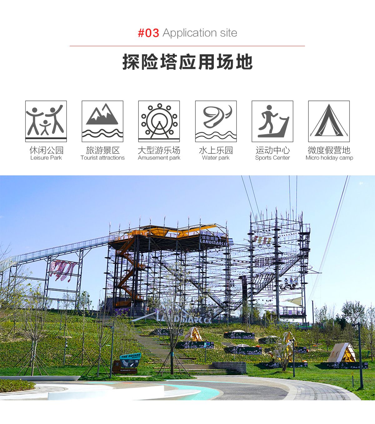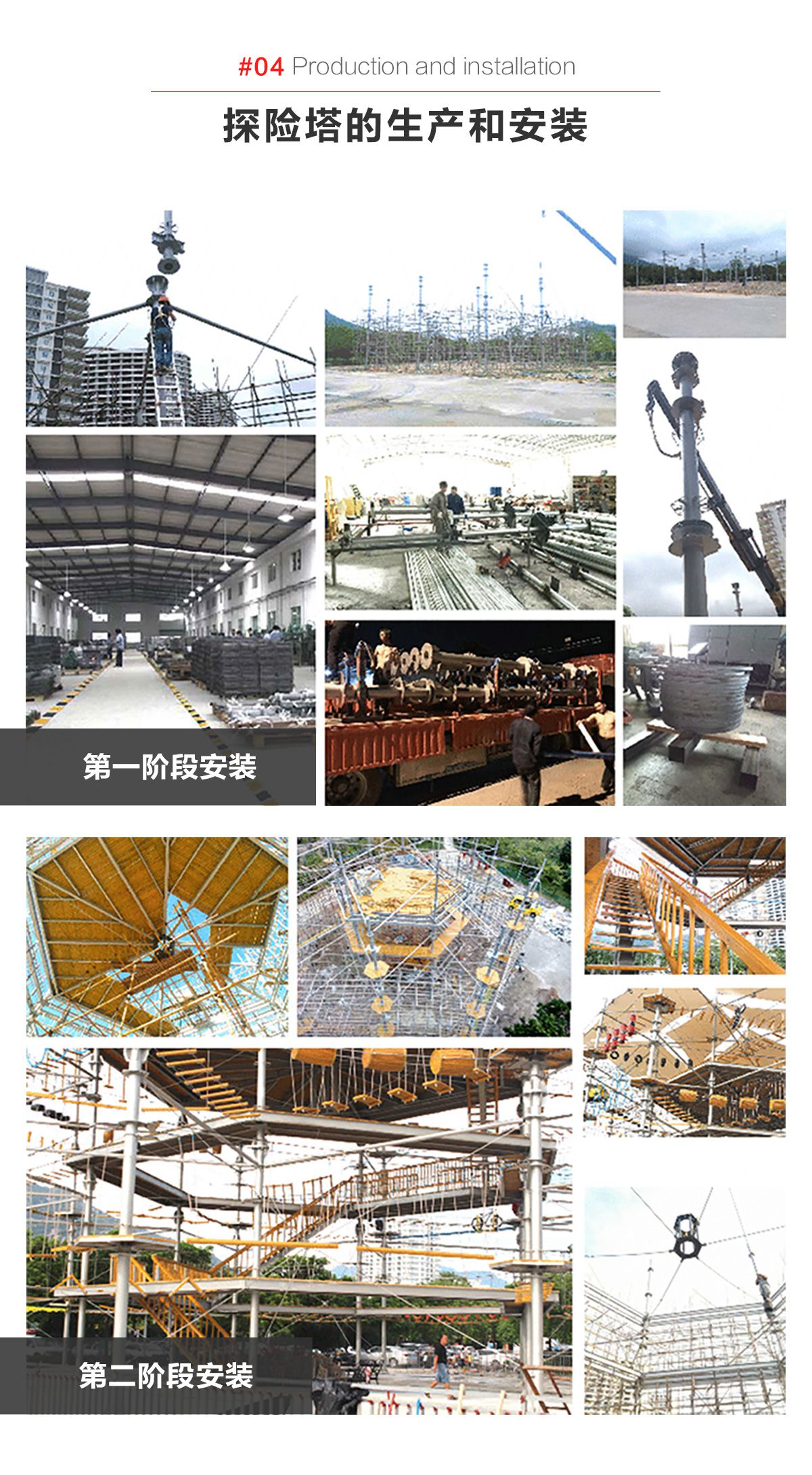 匯集 200 種游樂步道,適合廣大游客 水晶塔集冒險、運動、娛樂、挑戰于一體的綜合游樂類項目,通過在塔內設置并搭建各種難易不同、風格迴異、超強刺激的步道關卡,讓游客體驗高空墜落與自由滑翔的快感,感受塔內項目攀爬穿越的刺激。水晶塔是一個創新且極具盈利能力的全新休閑旅游項目,適合建在戶外,也可以建在窒內。 晶體結構,更穩固,更安全 水晶塔采用品體結構設計,每4根立柱為1個晶體結構,可根據客戶需求自由組合,晶體結構設計更大的增加設備的穩定性、利用率,保證客戶場地的實用率最大化,立柱之間做連桿支撐,根據結構設置觀景臺,可達 80~1000+m?,可作為餐飲,休閑吧,咖啡吧,酒吧等休閑休息區域,平臺下方懸空架連接桿支撐,平臺可同時承載 30-1000+人。 搭配我司自主研發生命系統,保障安全無死角自主研發自鎖式雙掛鉤,相互交替型安全保障永遠保證有一個掛鉤自鎖在鋼絲繩上面,保障安全無死角。