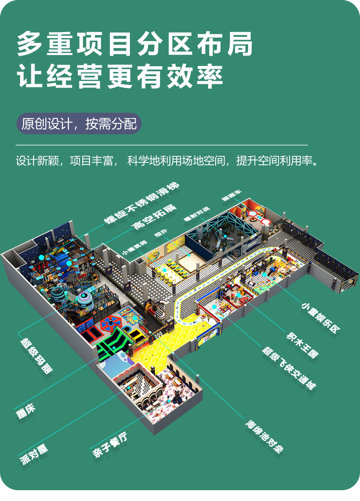 奇樂兒童樂園是包含淘氣堡、親子娛樂中心、彈跳迷宮、攀爬拓展、海洋球池等項(xiàng)目在內(nèi)的一體化游樂設(shè)施。它有別于傳統(tǒng)的單一游樂設(shè)施,相比而言奇樂兒童樂園在項(xiàng)目上更加的豐富,在結(jié)構(gòu)布局上更加的合理,在安全性穩(wěn)定性上更有保障,在收益渠道上更加廣闊,是目前兒童樂園項(xiàng)目的主流。